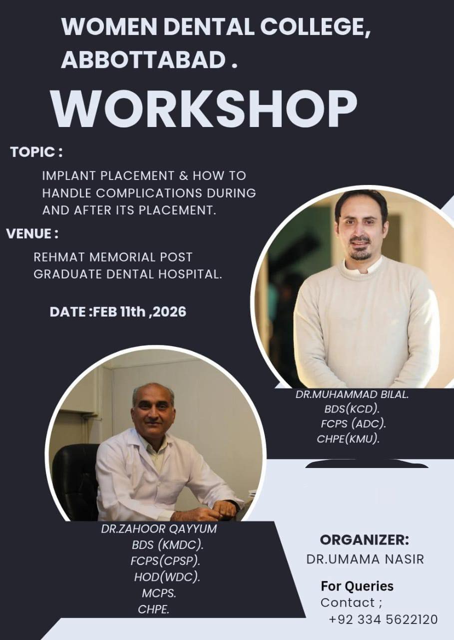 A comprehensive hands-on workshop on Implant Placement was successfully conducted at Rehmat Memorial Postgraduate Dental Hospital, offering participants practical training and updated knowledge in the field of implant dentistry. The workshop was organized by Dr. Umama Nasir under the supervision of Prof. Dr. Zahur Qayyum and was skillfully facilitated by Dr. Bilal, Dr. Akif, Dr. Shahid, and Dr. Abbas. The session provided valuable clinical exposure and contributed to advancing professional competencies in modern dental implant procedures.